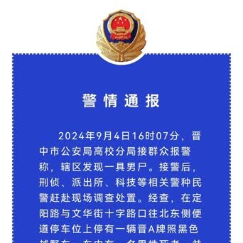 2024年9月4日16时07分,晋中市公安局高校分局接群众报警称,辖区发现一具男尸。接警后,刑侦、派出所、科技等相关警种民警赶赴现场调查处置。经查,在定阳路与文华街十字路口往北东侧便道停车位上停有一辆晋A牌照黑色越野车,车内有一名男性死者,并发现残留农药瓶。经核实死者系山西太原籍失联人员侯某。经现场调查、周边走访、法医勘验,初步认定侯某系自杀,排除刑事案件。目前,公安机关仍在进一步调查中。